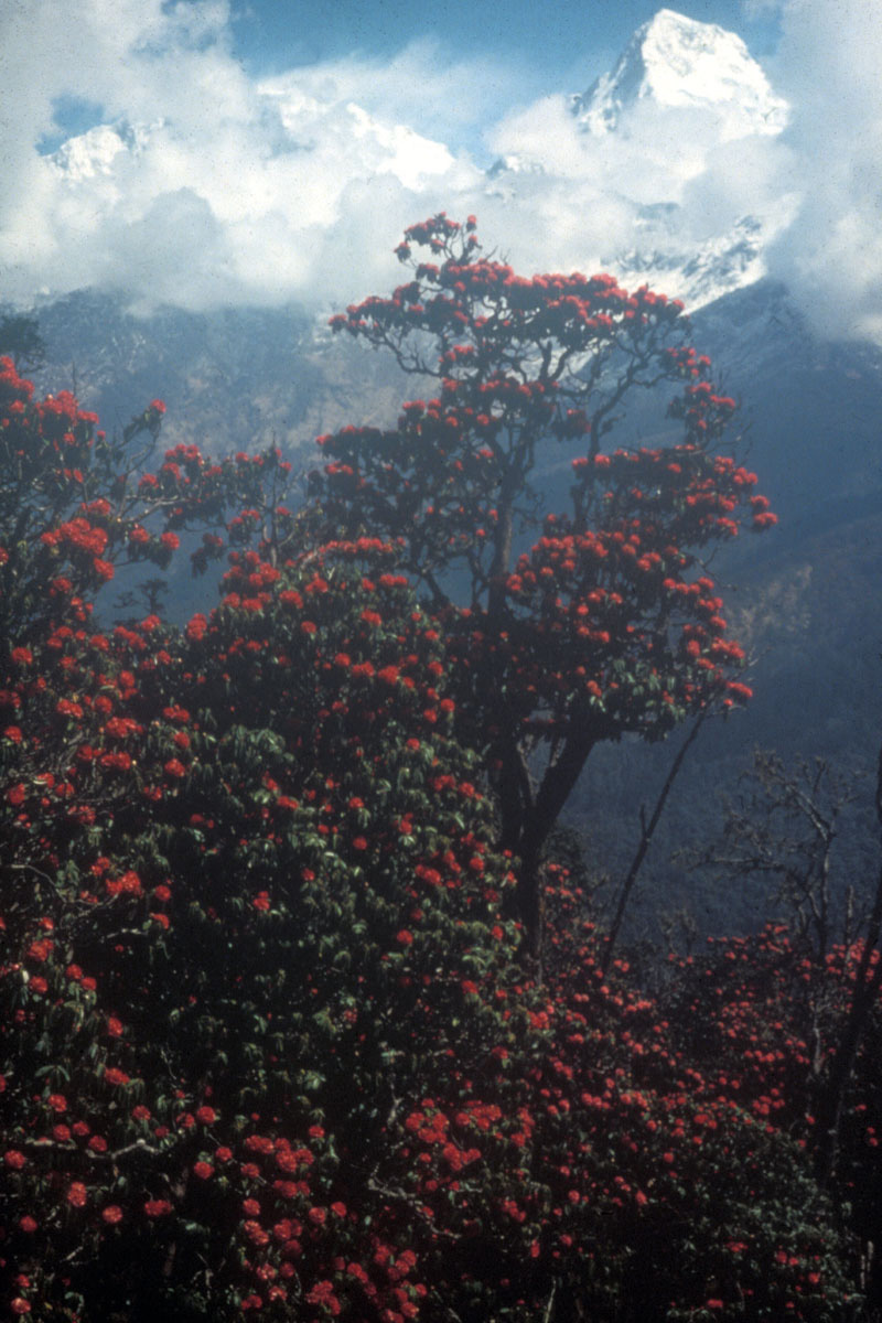 Rhododendron arboreum Flowering against the backdrop of the Himalayas in Nepal Photo: Tony Schilling |
