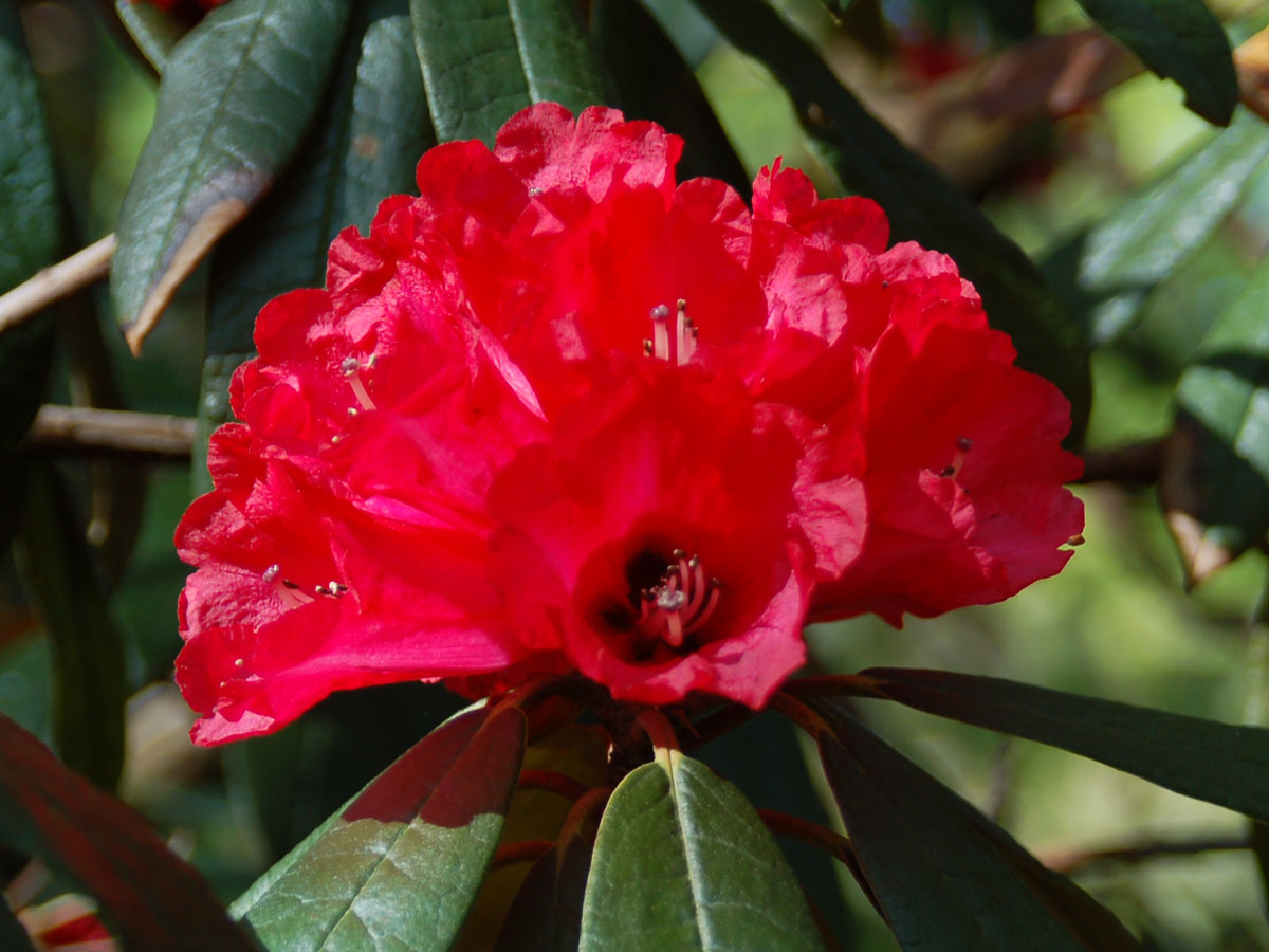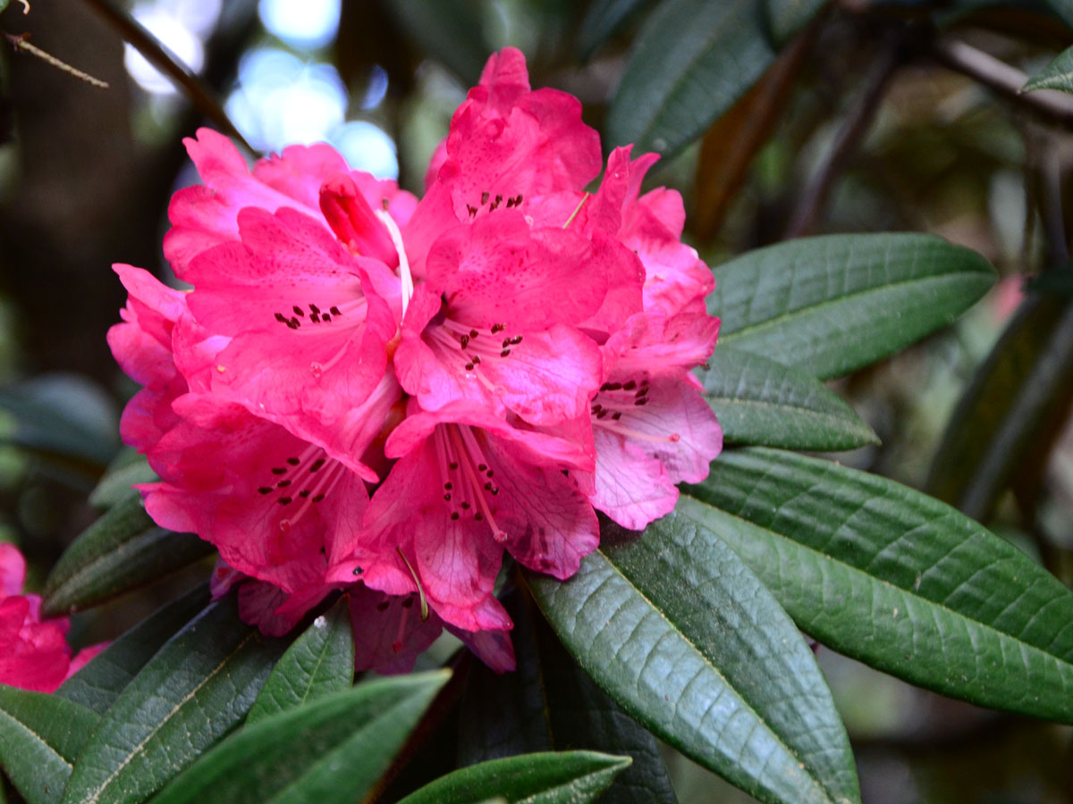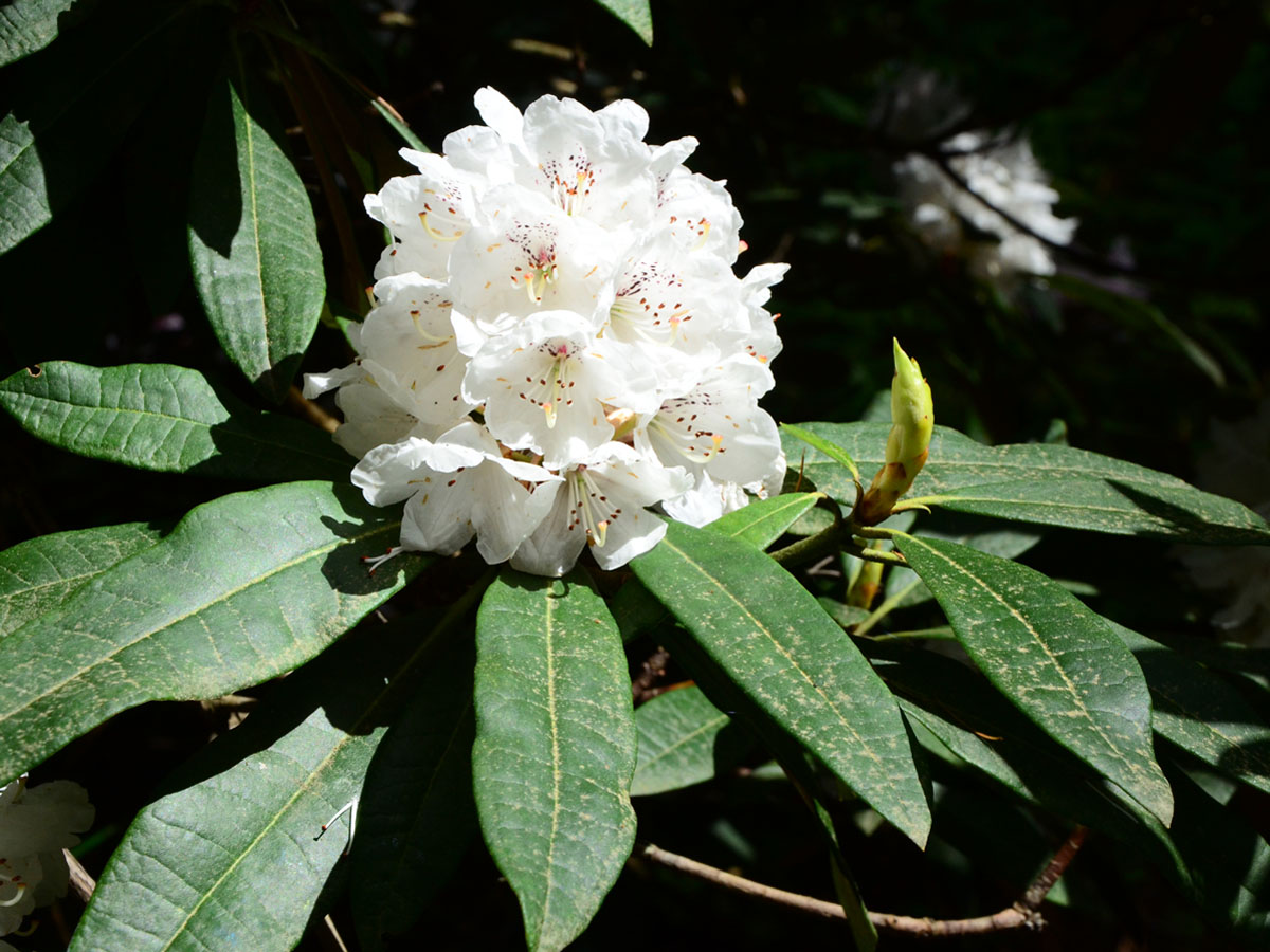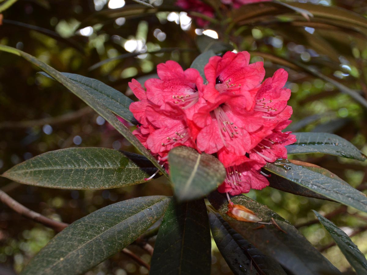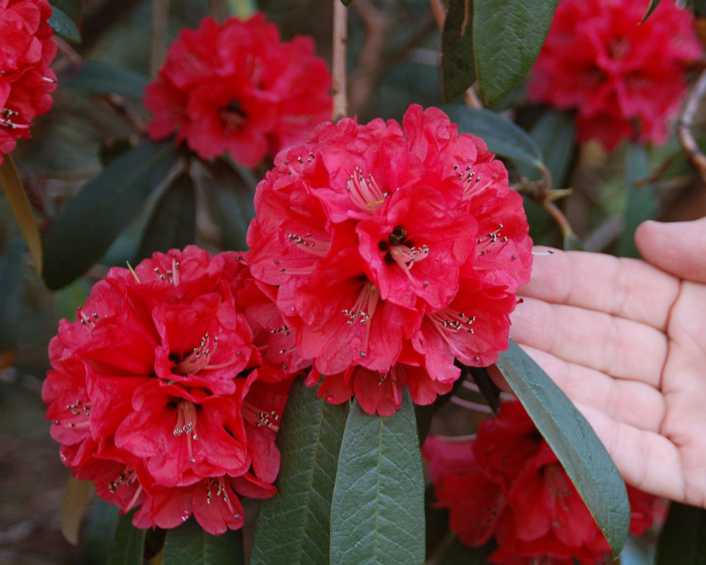 I doubt that I will never see that area in person but it is surely one of the most spectacular floral displays on this earth. We didn’t want Tony to stop but when he did conclude his remarks, many of us flocked to the podium to thank him for such an inspiring presentation. Tony kindly offered to send me a copy of one of his slides that I could share with others. The photo to the right is a scan of that slide. Thank you, Tony! I look at that image whenever I need inspiration, or when I need to explain to others why we must preserve wild places. Yes, Tony has inspired many of us. I learned that he had spent two years in the 1960s helping to establish the National Botanical Garden of Nepal in Godavari. The expert guidance he provided at that time has helped make the garden a world class facility. It is probably the only arboretum in the world that has totally eliminated the use of plastic. I was happy to see that Tony was honored in 2019 by the Government of Nepal for his major contributions to horticulture in their country. More Information Here Rhododendron arboreum is one of the most widely distributed species in the world growing in broad areas of Southeast Asia, especially near the Himalayas in South Western China, Northern India, and Nepal. It is a tree, often reaching heights of 80 feet tall (24 m) or more. The typical form has blood red flowers in large, tight trusses of up to 20 blossoms, and each flower can measure up to 2 inches across. Some forms at higher elevation are rose, pink or even white. The dark green, deeply veined foliage is stiff and pointed, making an elegant collar to frame the formal trusses. The world’s largest rhododendron of any kind is a specimen of R. arboreum discovered in 1993 at Mount Japfu in India. It measures 108 ft tall (33 m). Blooming typically in March and April, the stature of mature specimens is amazing but the setting where they grow in places like Nepal with the snow-capped Himalayas in the background is beyond perfection. Nepal has named this plant its national flower. Never having seen R. arboreum in the wild, I am writing this article from personal observations of some gardens I have visited and through the eyes of others. In addition to Tony Schilling, want to give special thanks to Sonja Kassels of Bremen, Germany, who provided the image below taken while strolling through a forest of huge R. arboreum trees in Nepal. I also want to thank Dr. Hartwig Schepker, Director of the Bremen Rhododendron Park, for his photo of a solitary R. arboreum in Sikkim. The rest of the photos were taken by the author. |
