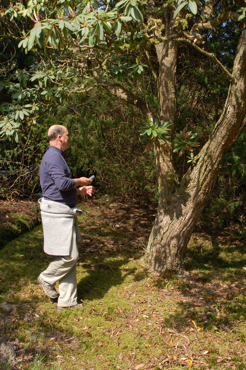 Steve Krebs inspects the trunk of R. arboreum ssp. cinnamomeum var. roseum at Benmore. |
