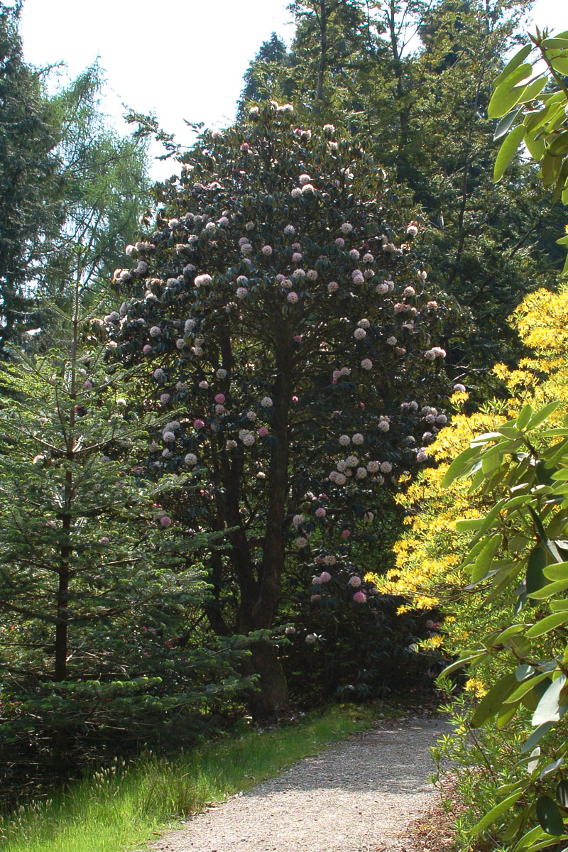 The best reds are forms of R. arboreum ssp. delavayi from lower elevations near the Himalayas and R. arboreum ssp. zeylanicum from the island nation of Sri Lanka off the coast of India. They are much less hardy than other forms but they do seem to survive in some sheltered gardens. R. arboreum ssp. cinnamomeum is much hardier since it tends to grow at higher altitudes in the region. The flower color can be pink to carmine, and occasionally white. It seems to be hardy in the UK and Pacific Northwest, but I have not seen it in the eastern US. I was very impressed with a white R. arboreum I had seen in June Sinclair's garden. Her lovely woodland garden is on the sheltered Olympic Peninsula. You walk among mature rhododendrons, tall evergreen trees, and there are wonderful wildflowers and ferns at your feet. It is easy to imagine you are in some wild rhododedron paradise. White forms of R. arboreum are rare and there is a stunning plant of the same variety at the Rhododendron Species Botanic Garden. Steve Hootman has it in a very prominent spot along a main path and it is backed up by a gorgeous Sycamore Maple, Acer pseudoplatanus 'Brilliantissimum' that always draws attention. Steve tells me its official name is R. arboreum ssp. cinnamomeum var. roseum forma album which is certainly a lot to put on a name tag. He says it is one of the finest specimens and they may eventually give it a varietal name. The selection originally came from Trewithen Gardens in the UK. The pure white flowers do have occasional crimson spots on the corolla. The flawless plant habit is full and well rounded with long, dark green leaves. The foliage collar is a perfect stage for those formal, conical trusses. Steve Krebs, Karel Bernady, and I were unable to attend the 1997 ARS Convention in Oban, Scotland, so we decided to tour some Scottish gardens on our own after a 2008 Rhododendon Conference in Edinburgh. One outstanding spot was the Benmore Botanic Garden where we admired a large R. arboreum ssp. cinnamomeum var. roseum that was becoming a tree. It was an impressive specimen with multiple trunks and attractive gnarled bark. The textured foliage was dark green and the lovely rounded trusses opened pink and faded to blush white as they aged. Several selections of this species have won awards including a rich rose pink named R. arboreum 'Tony Schilling' which received the F.C.C. award. |