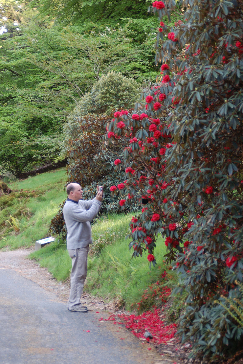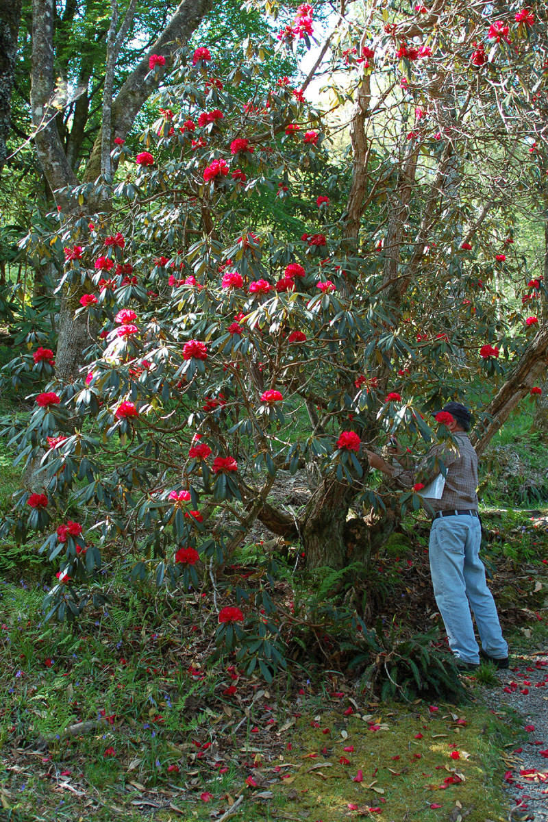 Karel Bernady inspects R. arboreum ssp. delavayi at Crarae Gardens, Scotland |