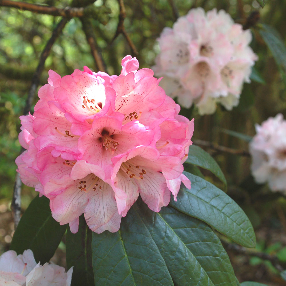 R. arboreum ssp. cinnamomeum var. roseum at Benmore Flowers open pink and fade to a blush white. |