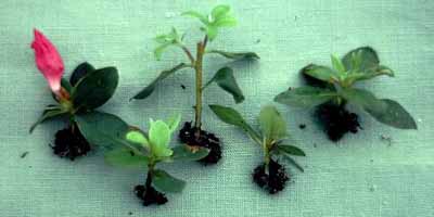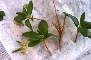Since rhododendrons and azaleas are shallow rooted, I make short cuttings about1 to 2 inches long. I also remove any flower buds since attempting to bloom will use up energy.
