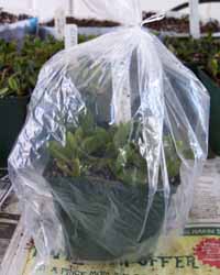 Next, I dip the end of each cutting in a rooting hormone such as Dip 'N Grow, and insert the bottom inch into the potting medium. When the container is filled with cuttings, I enclose the pot in a plastic bag to make a mini-greenhouse.