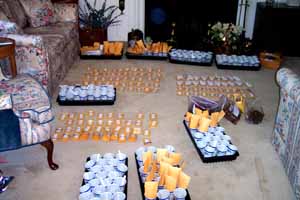 After collecting all orders, I determine how many requests there are for each variety, and divide the seed into an equal number of piles so every person will get some and put each portion in a labeled envelope. To the left is a picture of my living room floor as I am getting ready to fill the orders. It is yet another reason why I don't vacuum!