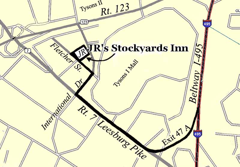 JR’s Stockyards Inn is conveniently located off of International Drive adjacent to Tysons Corner Center in Northern Virginia. From the Beltway (I-495), take exit 47A onto Leesburg Pike (Route 7) heading toward Tysons. Stay to the right and at the second stoplight (just past the entrance to Tysons Corner Center), turn right onto International Drive. At the next intersection, turn left onto Fletcher Street between the Silver Diner and Chevy Chase Bank. JR’s Stockyards is on the right, just past the bank.