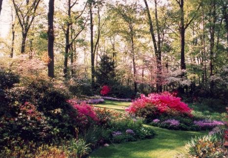 For a rhododendron and azalea garden, plan the empty space first. With annuals or low growing perennials, one's consideration is with the flower bed, but when plants grow tall such as rhododendrons, it is much better to plan the open area because tall plants will make walls in your garden.