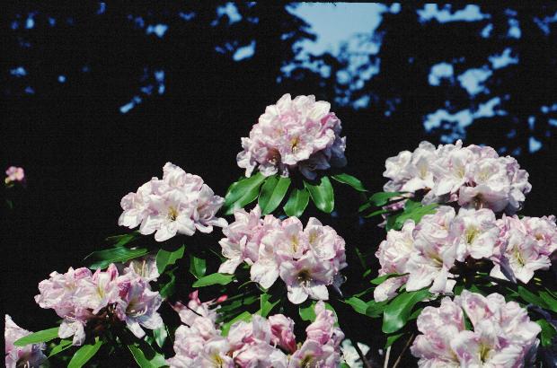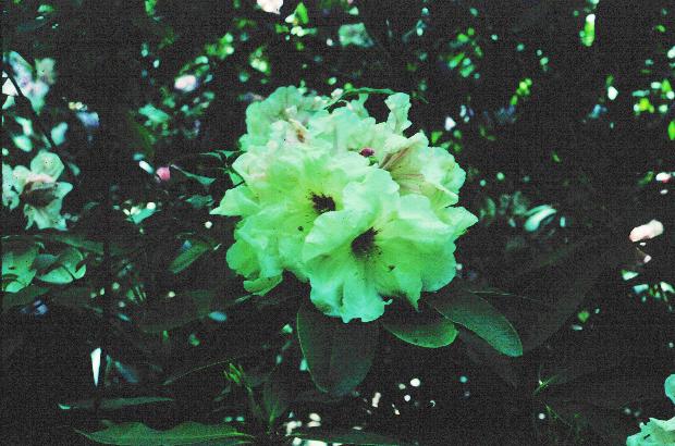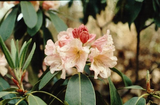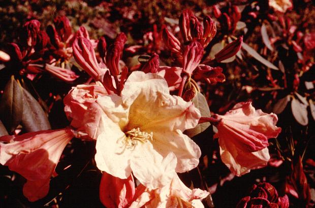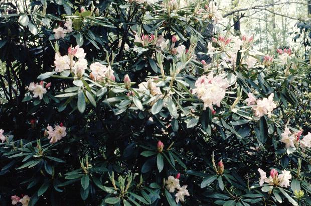 Gable's Peaches- parentage unknown. A 12 foot plant bloomed for me on Bent Mountain, and put on quite a show in fair shade. I don't know how it would do in more exposure. Probably a smirnowii cross.
