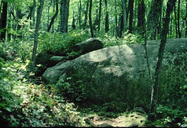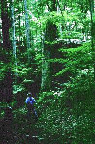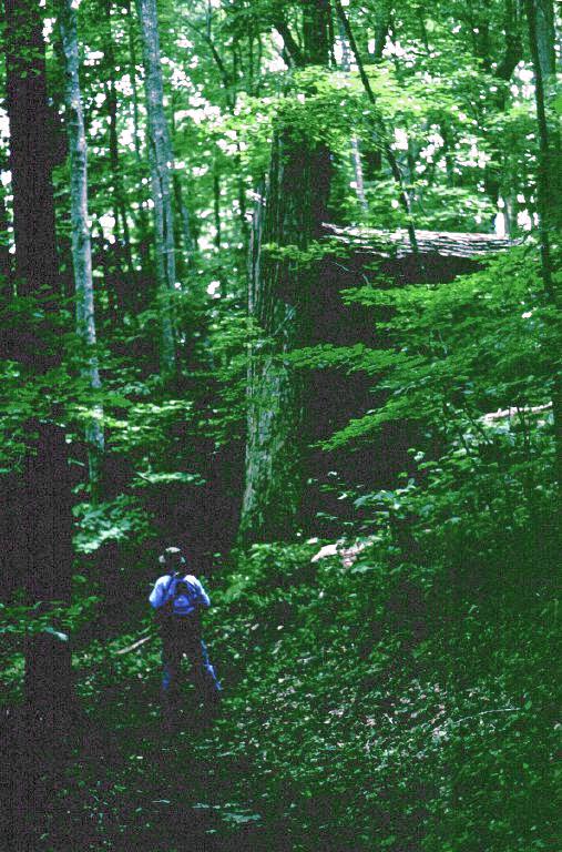 The first portion of the trail travels along Forge Creek, crossing the picturesque rushing stream several times as it winds through dense thickets of Rhododendron maximum and virgin forests of hemlock and tulip poplar. Many of the magnificent trees are four feet in diameter at the base and tower hundreds of feet above the forest floor. Some trees have been damaged by storms, losing their tops to lightening, wind or snow damage over the centuries, and others have fallen to the earth, now serving as "nurse logs" for the next generation. I was also impressed with the wealth of wildflowers in the area, especially massive beds of the dwarf iris cristata growing along the trail. What a display that must be in early spring!