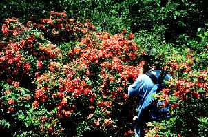 On my first trip, I had a little over an hour to wander among the magnificent plants that are growing on Gregory Bald. We had a late start that day and had to add several miles to our hike because of a closed access road. Shortly after we arrived at the summit, storm clouds started gathering and a passing park ranger cautioned, "You do not want to be up on this mountain when the storm hits." During our hasty retreat that afternoon, I can still remember the vision one of the most awesome sights of nature I have ever seen. As the thunderstorm closed in on the bald, its rolling gray clouds seemed to reach down from the sky like long, curling fingers and grab the ridge. Crackling lightening and rumbles of thunder were all around as we reluctantly rushed down the trail. Holding off rain with a broken umbrella tied together with green dental floss, I was certain that I would become one of those lightening strike statistics. But I reasoned that my life was now complete since I had finally seen the mountain in its glory. Fortunately, on my second trip to Gregory the weather was settled and we were able to spend over four hours strolling among the acres of azaleas after the modest 3 1/2-hour trek to the summit.
