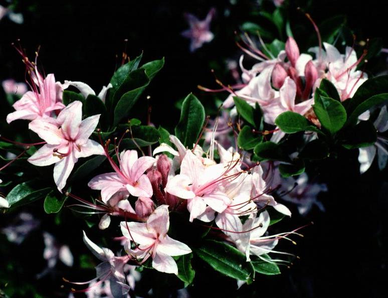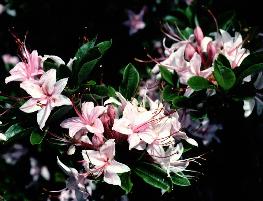 I am still amazed at the quality and diversity of the hybrid swarm on Gregory Bald. Some of the plants are among the most beautiful hybrids I have ever seen anywhere. In over 30 years of hybridizing, I have produced little that can compare with what is growing naturally on this mountain. The overall landscape beauty of the bald also struck me since it seems to be touched by an artist's hand. At the east end of the bald, just to the right (north) of our initial entry point, there is a magnificent blush-white azalea with dark green foliage that is tucked under a gnarled oak tree. It was as though some skilled landscaper had taken great care to position this very choice plant in a perfect setting to highlight the grand entry to the garden. The large, fragrant flowers of this azalea are brushed with pale pink and have a prominent gold blotch and red stamens, hinting that R. arborescens was a likely parent.