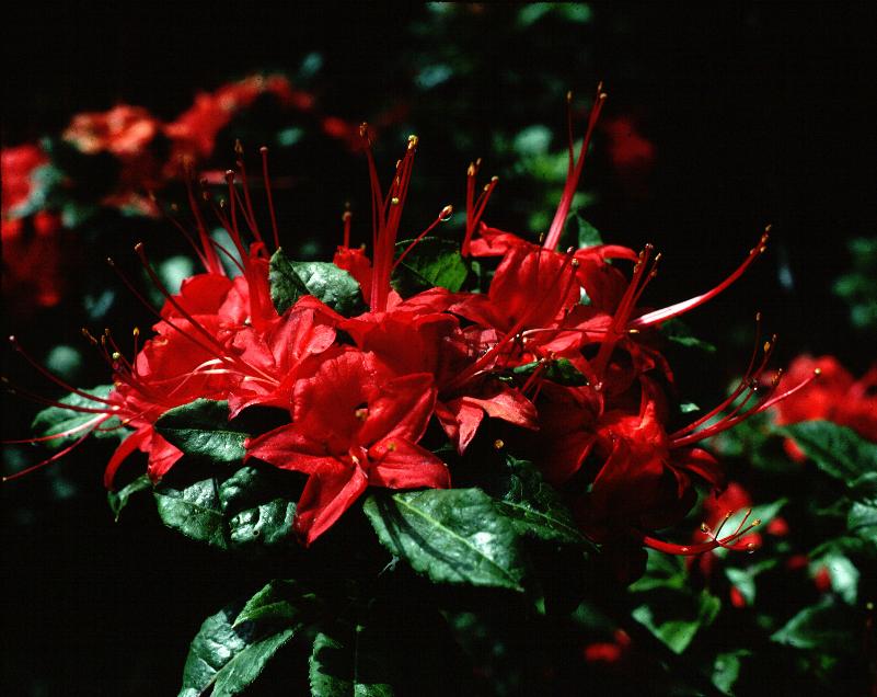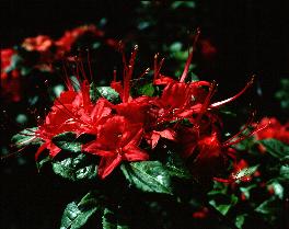 We took many rolls of slides and made notes on plants that we felt should be listed as our "top ten" on Gregory, but our list continued to grow. Maybe we could select the best three of each color form instead. One of our favorites included a plant we call "Christmas Red", possibly an excellent form of R. cumberlandense (formerly R. bakeri) with its holiday-festive color scheme of bright red flowers and glossy deep green leaves. It is also one of the larger plants on the bald, and is located on the south side near the edge of the encroaching scrub forest. In that general area is an azalea we call "Goldilocks", a brilliant gold that is brushed with orange, one of the most striking shades imaginable and so heavily flowering that it nearly hides the foliage. Adjacent to Goldilocks is probably the best of the deep pinks with a gold blotch, an azalea I refer to as "Cover Girl" since it was featured on the cover of that Spring 1996 ARS Journal. There are several nice yellows nearby, but as we noticed on our first trip, many of the yellows were a past peak condition. Many of the yellow flowered azaleas seem to bloom ahead of the rest on Gregory, although we found some new selections that were just opening up this time.