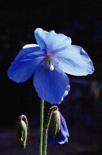 the rare blue Himalayan poppies (Meconopsis sp.) growing along the walkway