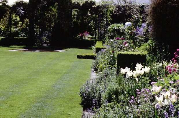 The large, rectangular lawn is flanked on both sides with perennial borders,