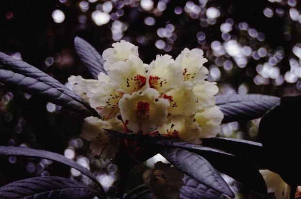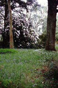 grass under a large leaved rhododendron that was in full bloom. Here was