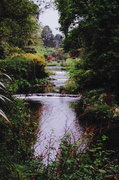 lovely vistas of the gently rushing waters framed by tall trees, rhododendrons,
